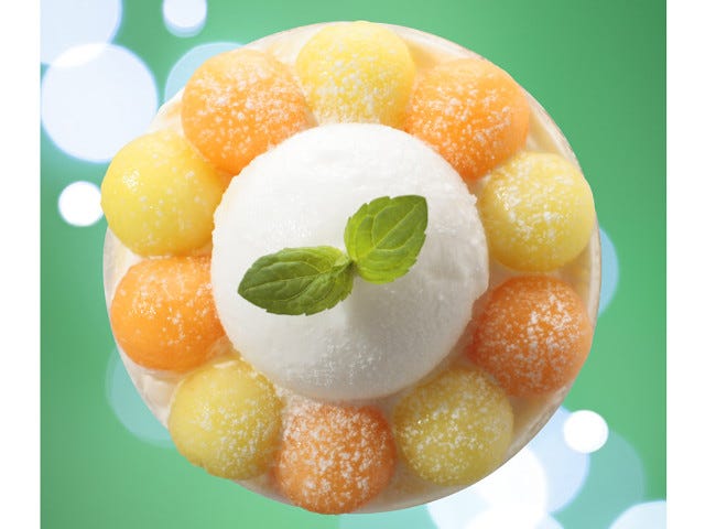 コロコロと丸いメロンのデコレーションが可愛らしく、緑、白、オレンジが重なる層が目にも涼やか。2種類を使用し、異なる味わいを楽しめる。ココナッツのシャーベットと、メロンの果汁を凍らせて粗く砕いたシャリシャリ食感のグラニテは夏にピッタリな爽やかな一品。