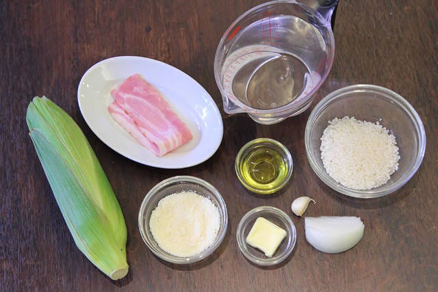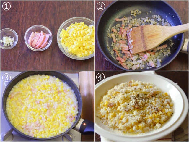 ① トウモロコシの身を削ぎ落とす。タマネギ、ニンニクはみじん切り、ベーコンは1cmスライスにする。