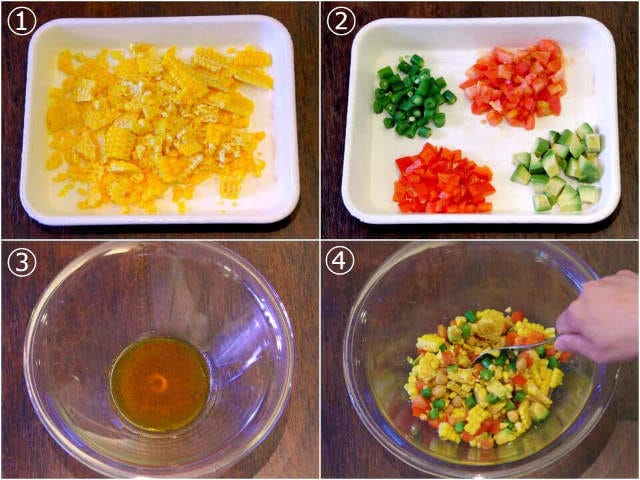 ② パプリカとインゲンはそれぞれ1cm角に切り、下茹でして冷ましておく。トマト・アボカドもトウモロコシの粒くらいのサイズにカットし、①と合わせておく。