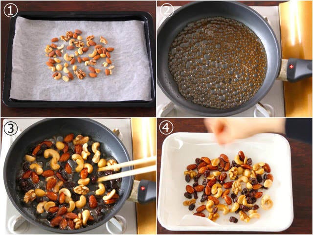 ③ 煮詰まったらすぐに、①のミックスナッツが熱いうちにフライパンに入れ、レーズンを加えて手早く絡める。
