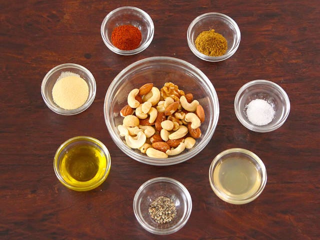 最後に紹介するのは、スパイシーな味わいの「メキシカンミックスナッツ」。チリやクミン、ガーリックなどのスパイスを、オリーブオイルとレモン汁と合わせてペースト状にし、ナッツと絡めるだけの簡単さ。