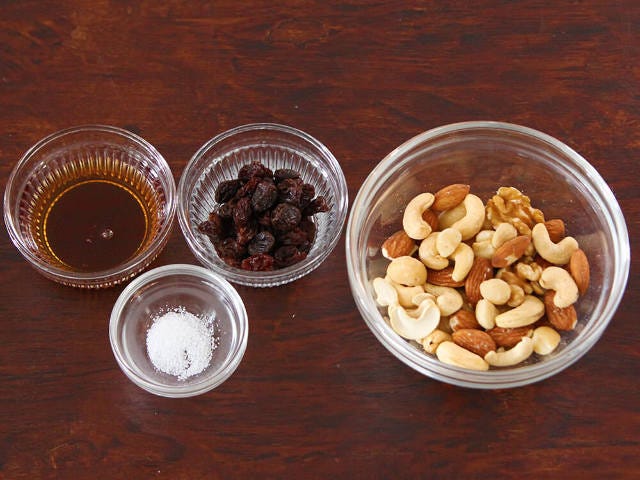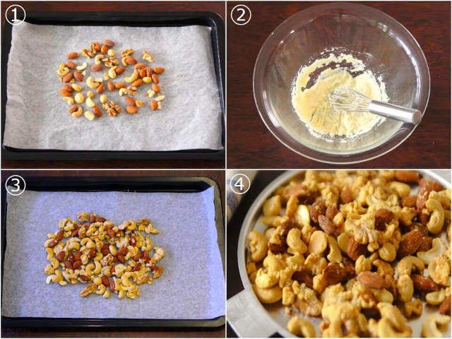 ① クッキングシートを敷いた天板にミックスナッツを広げ、160度に予熱したオーブンで10分焼く。