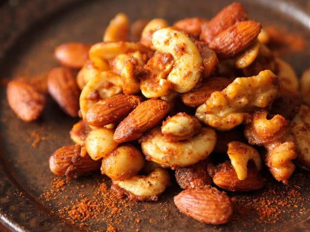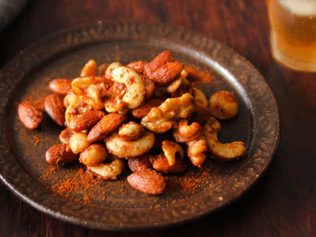 ついついあとを引いてしまうピリ辛味のミックスナッツは、ビールのおつまみにもってこいだ。