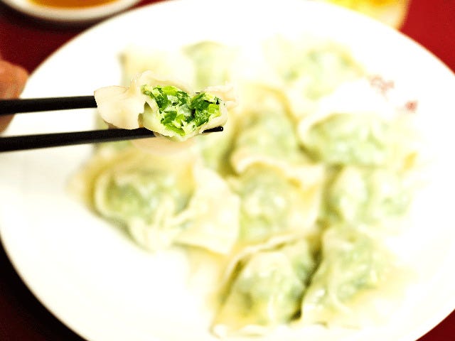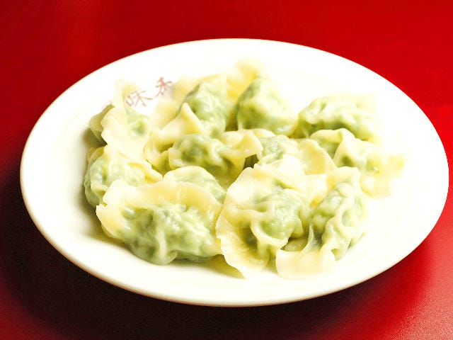 現在は100種類以上のメニューがある『異味香』ですが、平成3年にオープンした当初は水餃子専門店だったとか。というか、先代の孔子72代目、通称“仙人”が、この「海鮮水餃子(“翡翠(ひすい)餃子”)」を作りたくてお店を始めたそうですから、そうと聞いたら食べないわけにいきません。この水餃子に対する自信とかける思い、いざ受け止めん!