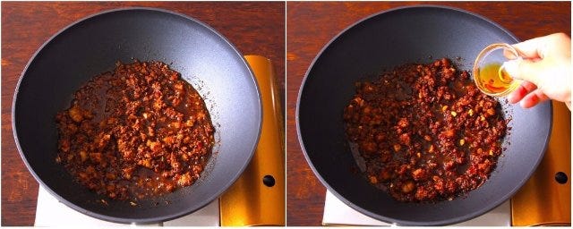 ④ 自家製ひき肉と長ネギを加えてさらに炒める。豚バラ肉の色が変わってきたらAを加え、水分がなくなるまで中火で炒める。