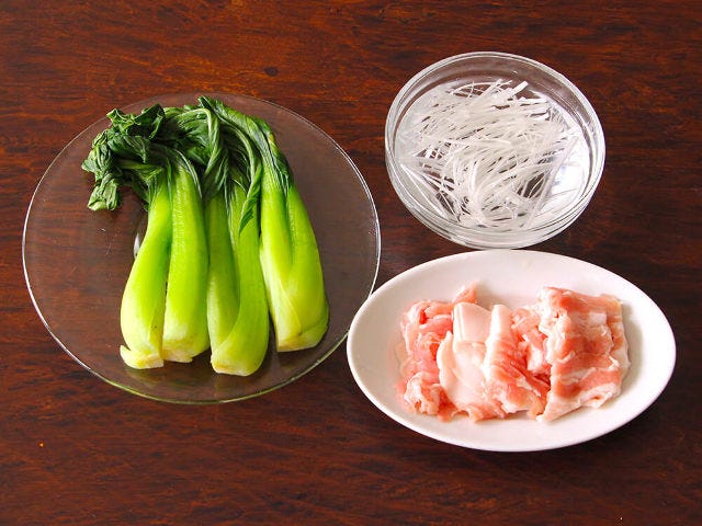 ① 長ネギで白髪ネギを作り、水(分量外)にさらしておく。チンゲン菜は熱湯で茹でて、縦に4等分に切る。豚バラ肉は2㎝の長さに切る。