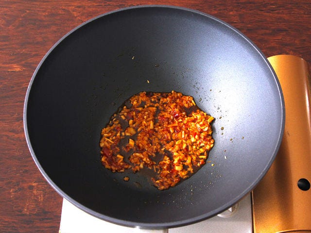 ③ フライパンにサラダ油を引いて中火で熱し、①のニンニク、ショウガを入れ香りが立つまで炒めたら、豆板醤を加えてさっと炒める。