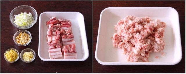 ② フードプロセッサーに①の豚バラ肉を入れて粗みじん切りにし、「自家製ひき肉」を作る。(フートプロセッサーがない場合は、包丁で細かく刻む)