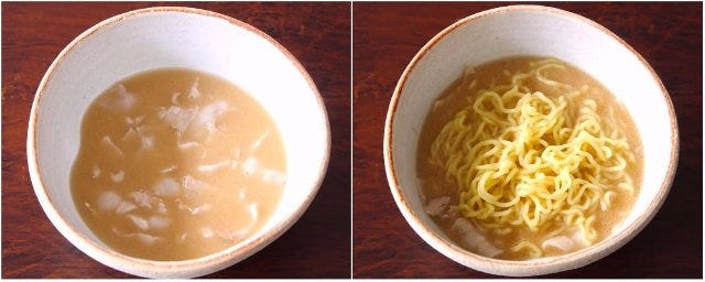 ⑤ 2つの器に③を1/2量ずつ入れたら、温めた②を1/2量ずつ加えて混ぜる。