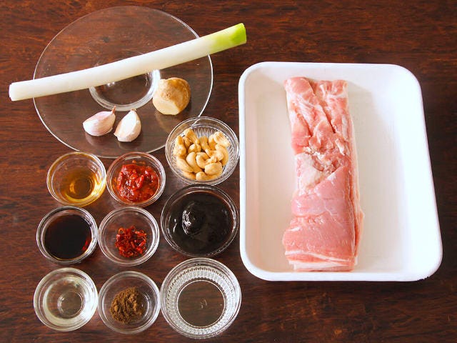 ① 長ネギ、ニンニク、ショウガ、カシューナッツをそれぞれ粗みじん切りにする。豚バラ肉を2㎝角に切る。