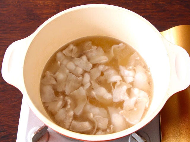 ② 鍋に水、鶏ガラスープの素を入れて強火で熱し、煮立ったら豚バラ肉を加え中火で3分煮る。アクがでたら取り除く。