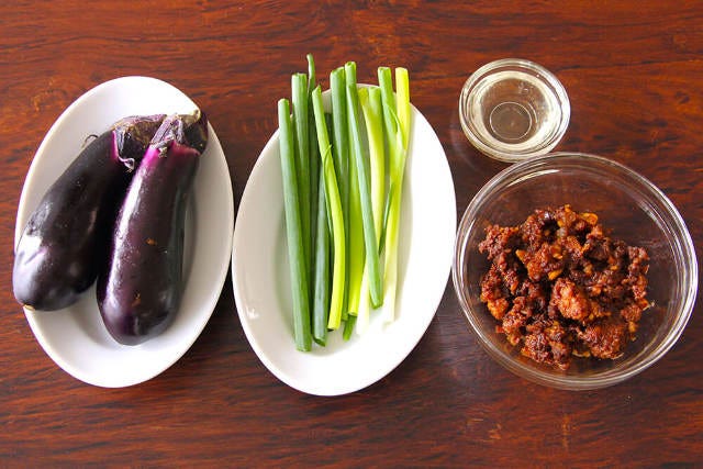 ① ナスはヘタをとり、縦に4等分する。