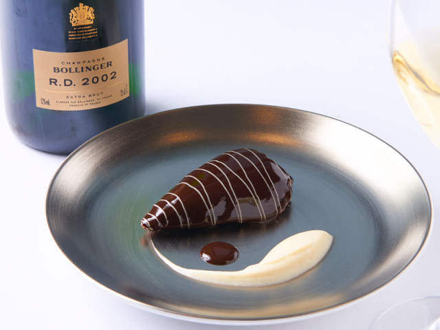 スペシャリテは「シャンパーニュ地方の赤ワインソースをまとった仔鳩のファルシー」。郷里の味を昇華させ、約100銘柄もそろえたシャンパーニュとのマリアージュも見事だ。