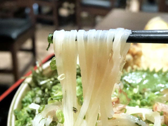 こだわりは天ぷらだけではない。麺にも徹底してこだわる。博多うどんは、食感がやわらかくコシの弱い麺を用いることが多いが、『大地のうどん』の麺は、透明感があり噛むとしっかりとしたコシがあるのが特徴。それでいてツルツルしていて喉ごしも滑らか。