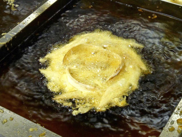 形を丸く揚げるのは意外に難しいが、ここが揚げ職人の腕の見せどころ。徐々に大きくなっていくごぼう天が完成していく過程はまるで芸術作品を観ているかのよう。