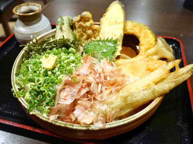ごぼう、ニンジン、エリンギ、かぼちゃ、ナス、しめじ、ピーマン、大葉などバラエティーに富んだ大きな天ぷらが山盛りだ。麺が見えないほどネギが盛られているのも特徴。