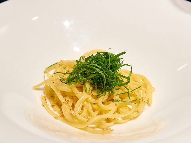 こちら『オー・ギャマン・ド・トキオ』の〆の定番。茹で汁と塩、バター、チューブワサビを和えただけのシンプルなパスタは、本ワサビではパンチがでないと木下シェフは言う。