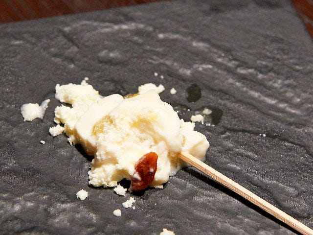 テーブルに並んだ途端、見たことないほどの大きなトリュフを前に「すごい!」と歓声がどよめいた。トリュフの妖艶な色香とフローラルな甘い蜜の香りに鼻をくすぐられる。蜜の正体は、白トリュフの表皮を漬け込んだアカシアの蜂蜜。なめらかなオムレツの食感と、ナッツのような風味とコリッとしたサマートリュフの食感がアクセントとなって、経験したことのない感触を生み出してくれる。