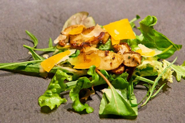 鉄板の上で丁寧にソテーされたサマーポルチーニ茸は、マスタードとクルミのオイルを使用したビネガーのドレッシングと絡んでエキゾチックな香りが漂う。セルバチコの苦みとミモレットチーズ、パルメザンチーズの濃厚なうまみに芳ばしさが交わる。
