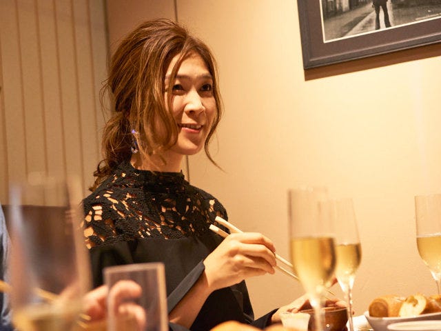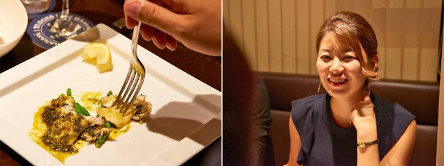 「アワビと金針菜の組み合わせは、中華料理を食べているようなニュアンスを感じました。ツブ貝は弾力があって、どんどんうまみが溢れてきます。ペアリングにいただいた爽やかなシャブリとのマリアージュも最高!」(中村マリアさん)