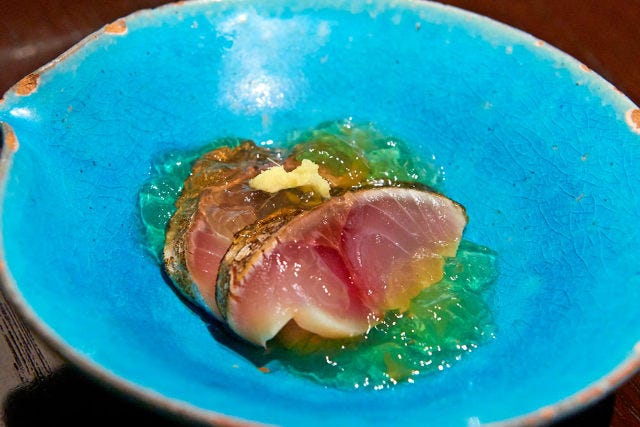 しっかりと身のひきしまったサバは、柔らかいジュレを纏って洋風に仕立てられている。口に含むと目の覚めるような酸の刺激がやってきて、〆サバ の身に溶け込んでうまみの余韻が残る。