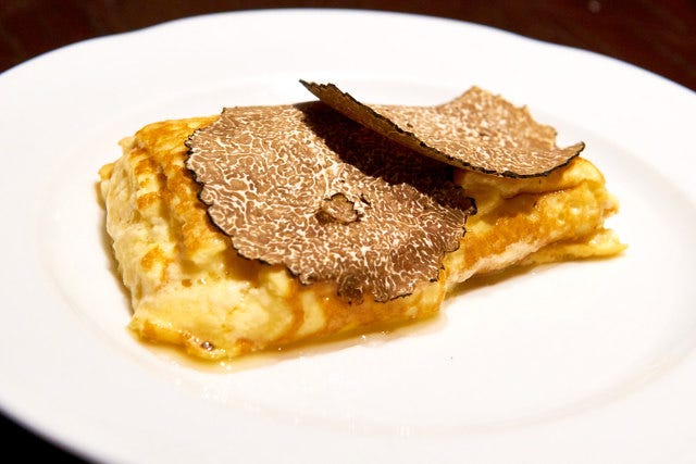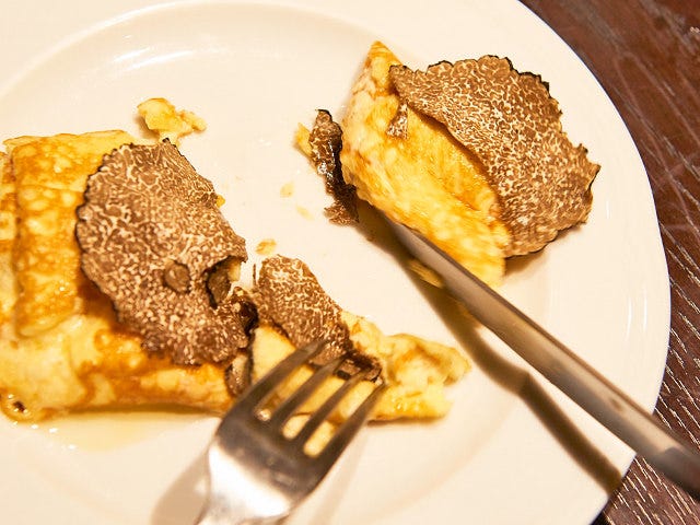 「ナイフを入れた瞬間からひろがってくるトリュフの香りに高揚しました。ペアリングでいただいているデザートワインのブドウの甘みと、オムレツにかかっているアカシアの蜂蜜の甘みから強いシンパシーを感じます。もう幸せ!」(五十嵐豪 さん)