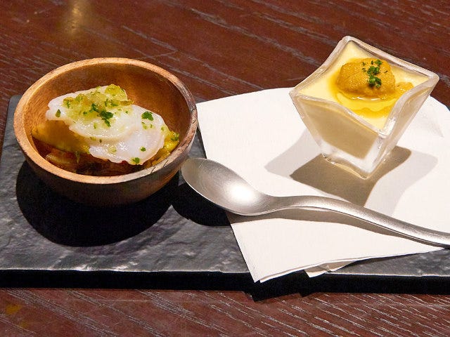一品目:冷菜の盛り合わせで、「水ダコのカルパッチョと生ラタトゥイユ 胡瓜の鬼おろしシャーベット」と「とうもろこしのムースと生ウニ」。