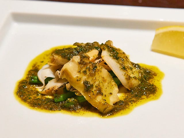 柔らかく蒸し上げられたアワビと、歯ごたえの良いツブ貝とのコンビネーションが楽しい一品。苦みの効いたアワビの肝バターソースは、貝のミネラル香をひきたたせる。「レモンを絞ってみてください」と木下シェフ。ほろ苦いソースに清涼感が加わって、どこか過ぎていく夏への未練を連想させる。