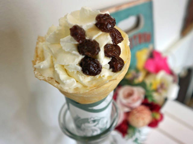 ラム酒にじっくりと漬け込んだ自家製のラムレーズンがたっぷりとちりばめられている、まさに大人のためのクレープ。