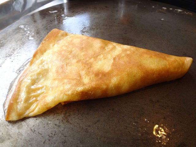 そのうちに、鉄板の熱でバターが溶け出し、生地に染み込んでいく。この工程のおかげで、中はしっとり、外側はパリっと焼かれた生地に仕上がるのだ。