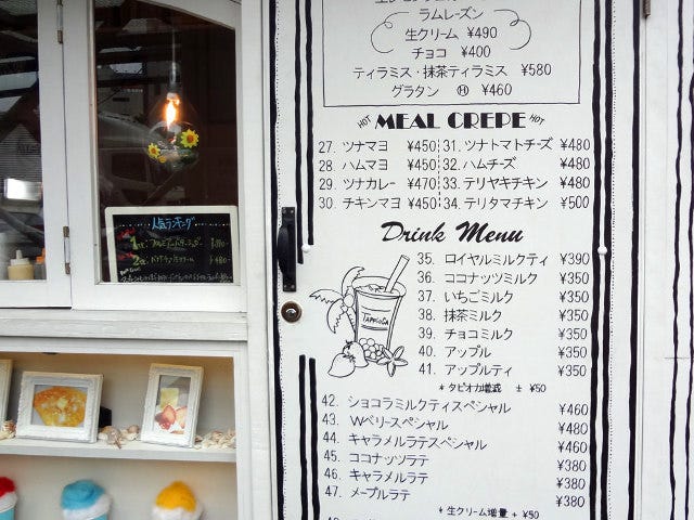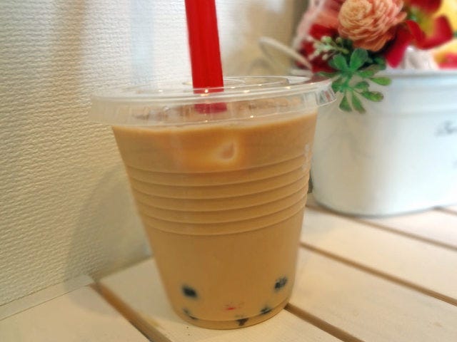そのほか、ドリンクメニューも充実。写真上は人気の『ロイヤルミルクティ(タピオカ入り)』。ミルクティも、お店で茶葉から煮出しているというこだわりよう。大粒のタピオカがたっぷりと入っている。甘さはひかえめなので、クレープにもぴったりだ。