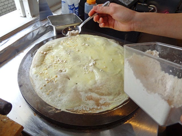 「プレミアムバターシュガー」は、まず薄く焼いた生地の表面に、たっぷりと、店長さんこだわりのバターを塗っていく。大きな塊のバターが惜しげもなく塗り込まれていく姿は圧巻だ。