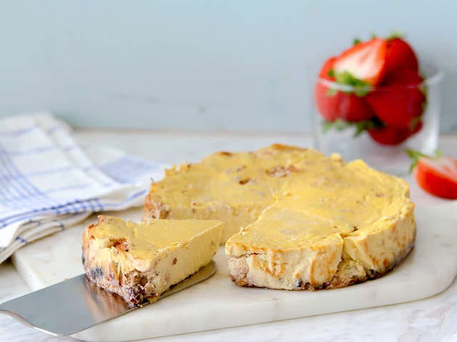 チーズケーキといえば、土台には小麦粉で作ったクッキー生地を使うのが一般的。でも、それだとグルテンが多く含まれてしまうので、クルミを入れて代用しましょう。ザクザクとした食感も良いアクセントになります。クリーム生地にも小麦粉を入れるレシピが多いですが、こちらのレシピでは小麦粉を使用しないため、チーズの味をより一層楽しめる上、ずっしりと濃厚な仕上がりになります。