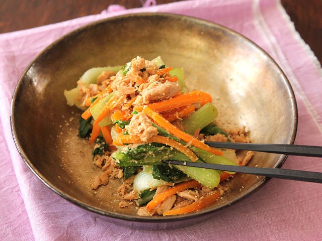 でも、だしマリネなら心配無用。しっかりと青臭さを消し、苦みを和らげてくれるので、サラダにもそのまま使える便利な常備菜となる。チンゲン菜に染みただしのうまみとツナのコクが絶妙に合わさって、ついつい箸が止まらなくなるおいしさに。
