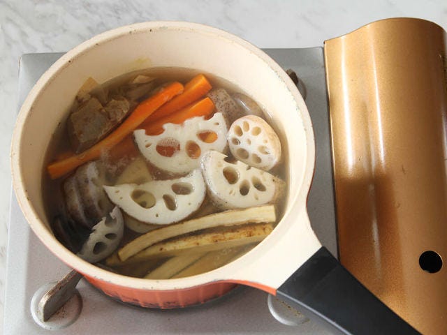 材料すべてを鍋に入れて軽く煮たら、そのまま保存容器に入れて放置するだけ。だしをしっかり吸い込んだ、深みのある味わいが魅力の「だしマリネ」があっという間に完成してしまう。