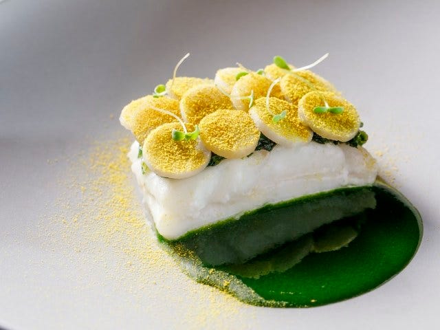 見目麗しい皿は「春菊を使いたい」という発想から生まれた。しっとりするくらいに火を入れた茨城県産のイシガレイに春菊のソテーをのせ、その上に菊芋と海老芋を薄く丸くスライスして並べ、食用菊で作ったパウダーをふりかける。最後に手前から香り高い春菊のソースをたっぷり注ぎ、さらに春菊のスプラウトを飾れば、まるでデザートのように華やかで美しい皿となる。まさに春菊のための逸品である。