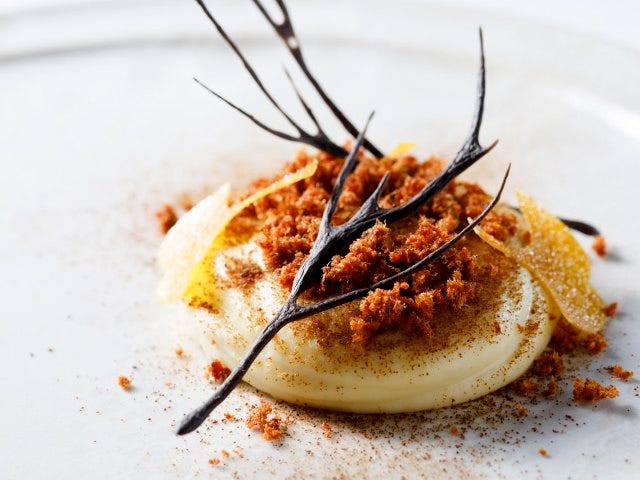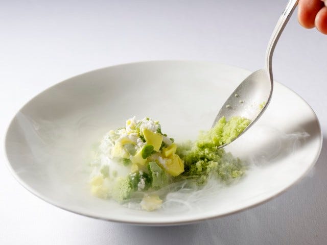 煙がたちこめたデザートは爽やかさ一色。砂糖シロップでコンフィにした国産レモンの皮にレモンクリームを絞りバタークリームのシャーベットをのせる。周りにはレモンとバジルのメレンゲをつけ、バジルのスプラウトをちょこんとのせていく。液体窒素で作ったバジル氷の食感たるや。作る工程が多い分子ガストロノミーのテクニックだからできる、ふわふわでシャリシャリの氷だ。甘酸っぱさと清涼感が口いっぱいに広がる至極のひと皿。