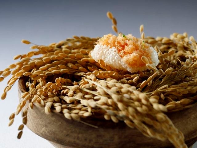 見た目ではまったくわからないこの料理は塩麹で炊いたおかゆの上に長野県産信州サーモンをマリネとフレークの2種類で重ねている。さらにすだちを削ったものを振りかけた。とにかく食感が面白い。サクサク、ふわふわ、トロトロ、「いったい何がどうなっているのだろう?」と興味がわく。口に入れるとほどなく溶けてしまうのであるが、サーモンの香りの余韻に浸りながら次の皿を待つのも楽しい。