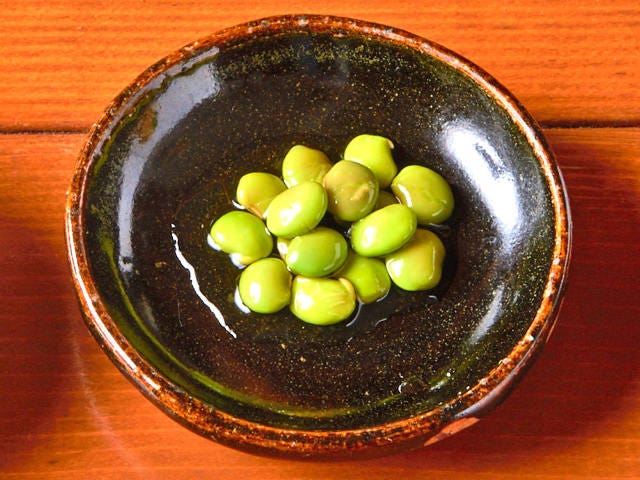旬の枝豆を使った「ひたし枝豆」は、枝豆の薄皮を向いた後、煮干し昆布だしと紹興酒、台湾産の甘い梅干を合わせた調味液に半日ほど浸したもの。一粒一粒にしっかりとだしが効いており、アルコールとの相性は抜群だ。