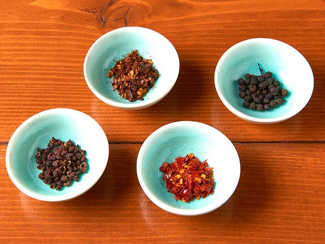 つづいて右上から時計回りに、鮮烈な香りが特徴のヒマラヤ産山椒、ピリッとした辛みのある赤唐辛子、熟成された独特の風味を持つ黒唐辛子、そして今年貴州省で買い付けてきたという木姜子(ムージャンヅ)。これら多種多様なスパイスと調味料が、同店の料理の味わいを大きく支えているのだ。