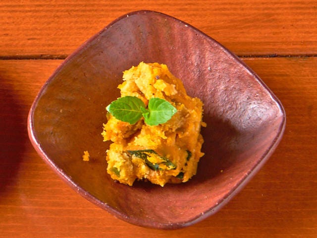 双方のホロホロとした食感がよく似た「カボチャとおからの炒め物」には、シナモンとヒマラヤ産の山椒、そしてレモングラスに似た香りと爽やかな風味が特徴の木姜子(ムージャンヅ)が風味付けに使われている。それらのスパイスが口の中でふわっと香り、噛めば噛むほど香りの奥行きを楽しめる。