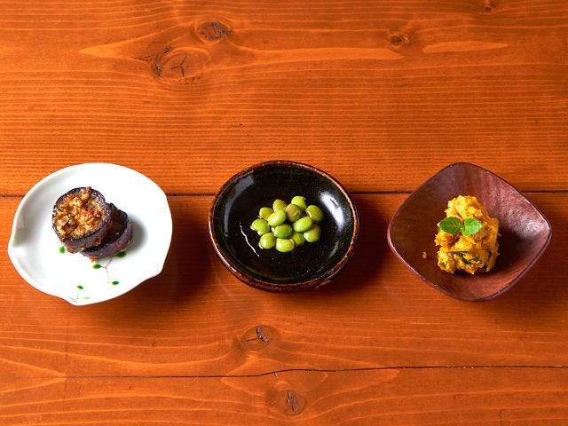 こちらの小皿料理は、お任せコースから「前菜3品盛り合わせ」(写真上)。右から「カボチャとおからの炒め物」、「ひたし枝豆」、「魚香茄子」の3品が並ぶ。