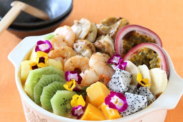 色鮮やかなトロピカルフルーツをたっぷり使った、ココナッツカレー風味のフルーツ鍋。
