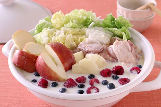 1.女性にうれしい美容成分たっぷり!「リンゴとベリーのオージュ風鶏のクリーム鍋」
