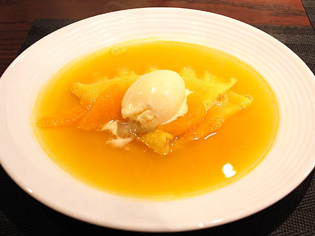 温かいカラメルオレンジソースを吸ったもちもちのクレープ生地とアイスを一緒に口に運ぶと、温かさと冷たさ、そしてオレンジの爽やかな香りが同時に口の中に広がり、五感を刺激する。