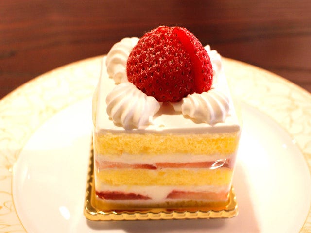 どこか懐かしい見た目のオーソドックスな「ショートケーキ」(写真上)は、生地にサクランボのリキュールをほんの少し加えることで、よりしっとりとしたスポンジ生地に仕上げている。食べ進めるとほんのり広がる甘酸っぱい香りに、心地よさを感じる。