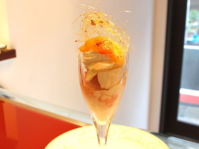 季節のフルーツで作るパフェも人気だ。夏場には「桃のパフェ」(写真上)が登場。ミントと桃の果肉のバニラアイスに、生クリームを使ったブランマンジェ、そこへサクサクとしたドライメレンゲと桃のコンポートを合わせたパフェは、季節の旬を凝縮したさわやかな味わいが広がる一品。(季節によりパフェの内容は変更となります。)