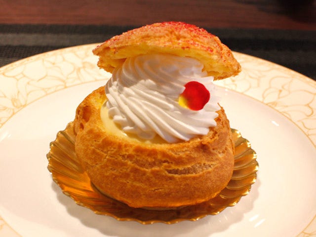 アシェットデセールの他にもケーキを豊富に用意している。西荻窪の南口商店街の愛称である「乙女ロード」にちなんで「乙女シュー」(写真上)と名付けられたシュークリームは、香ばしい生地にカスタードクリームと生クリームの2種類を贅沢に合わせ、ラズベリーパウダーとエディブルローズの花びらがあしらわれており、その名にふさわしい愛らしいビジュアルだ。