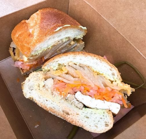ベトナム風サンドイッチ「バインミー」(写真上)も人気メニューの1つだ。豆腐、キムチ、ニンジンの酢漬け、パクチー入りのアイオリソースが入っている。サンドイッチの中に複数の酢漬けが入っている上に、ニンニクの芽やカブの酢漬けが付いてきて、ピクルスの世界を十分楽しめる。