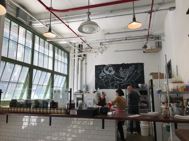 インダストリーシティに入居している飲食店はどこも工場を隣接し、生産している様子をガラス張りで見せている。どこでどのようにモノがつくられているか、ものづくりのストーリーと透明性、そして地産地消に関心をもつ消費者は多い。今夏初めにオープンしたカフェの『ブルックリン・ブライン&ダイン』もオープンキッチン。ピクルスの瓶が並ぶ向こう側はガラス張りで、奥の工場を覗き見ることができる。